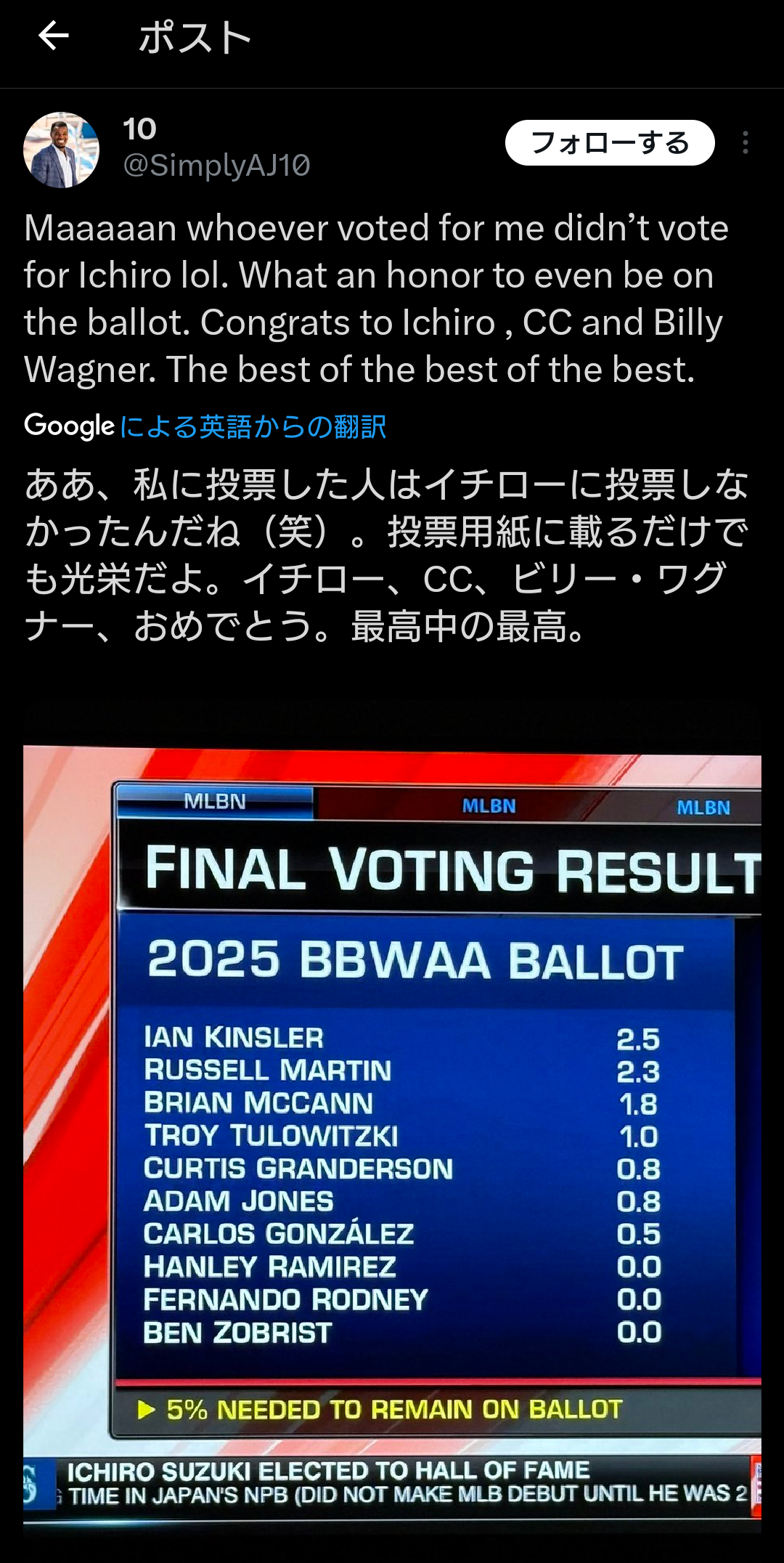 逆に満票やったら外国のレジェンドで多様性尊重の流れで忖度されたみたいな空気になりそうだしこれでええよな