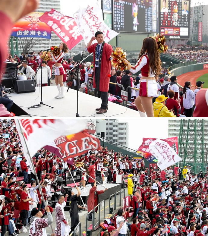 相手の攻撃中でも場内スピーカーで自軍の投手にガンガン檄を飛ばしている