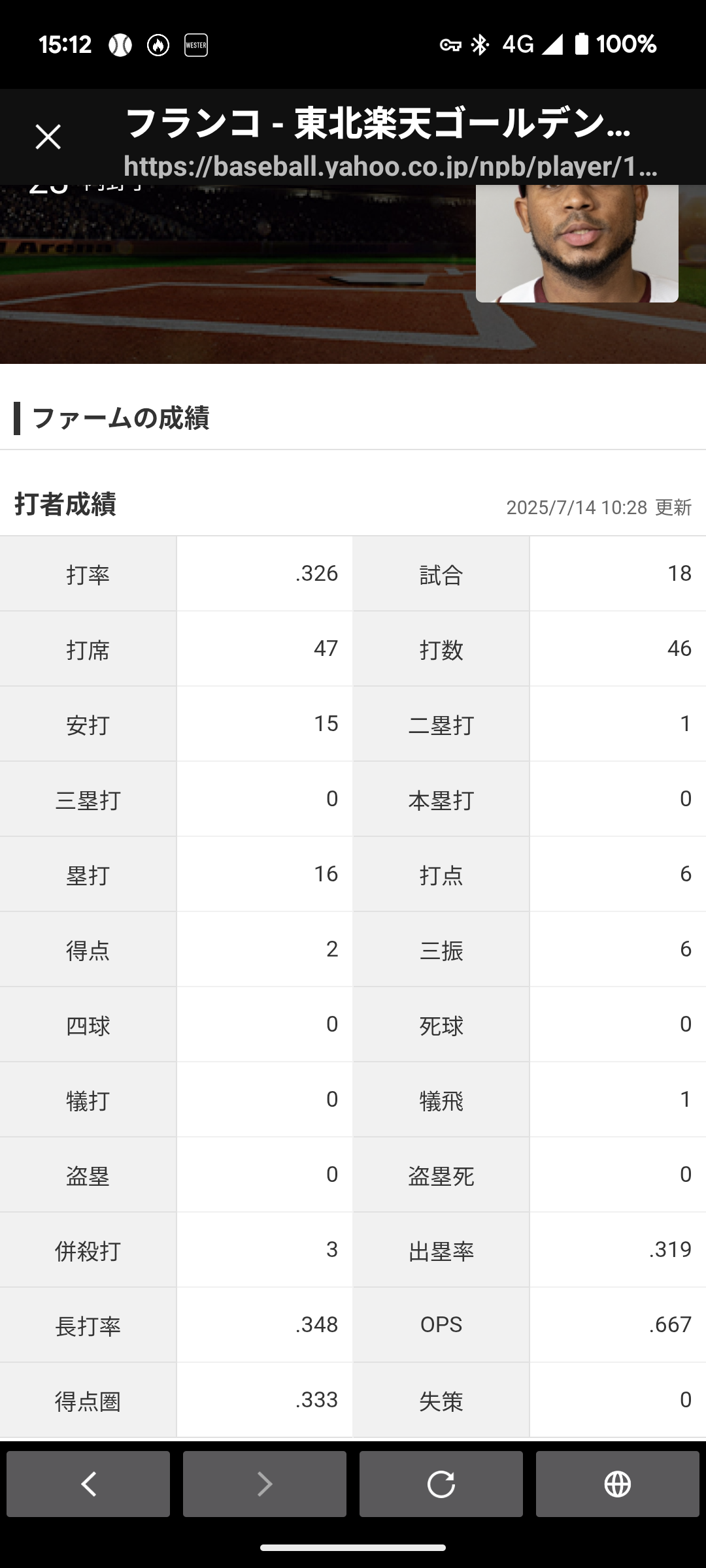 出塁率.319=(安打数15+四死球数0)÷(打数46+四死球0+犠飛1)